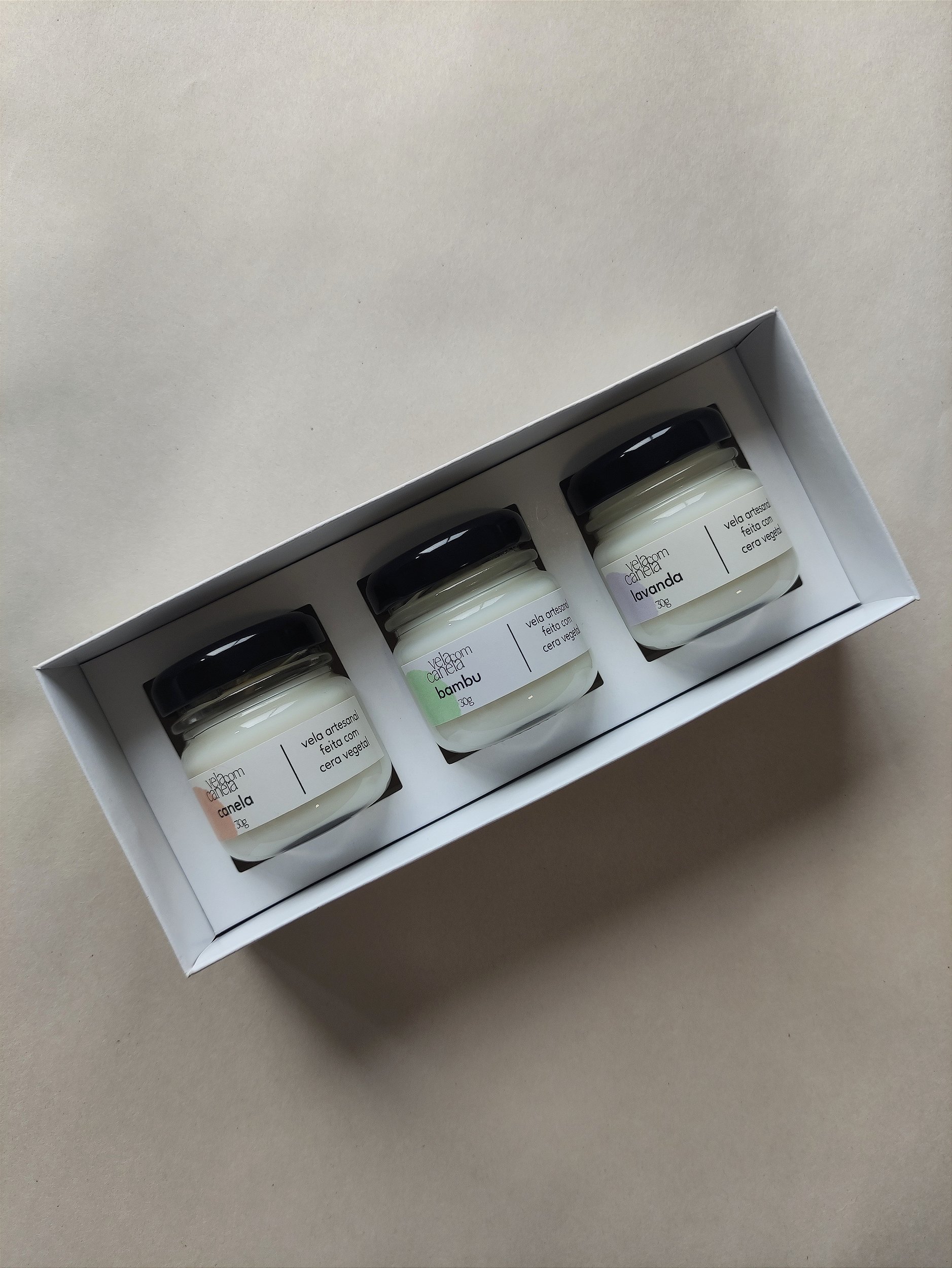 A caixa de mini velas Canela, Bambu & Lavanda inclui 3 mini velas de 30g de Canela, de Bambu e de Lavanda em uma caixa branca feita de papel cartão e dimensão 5 x 18,5 x 5 cm.